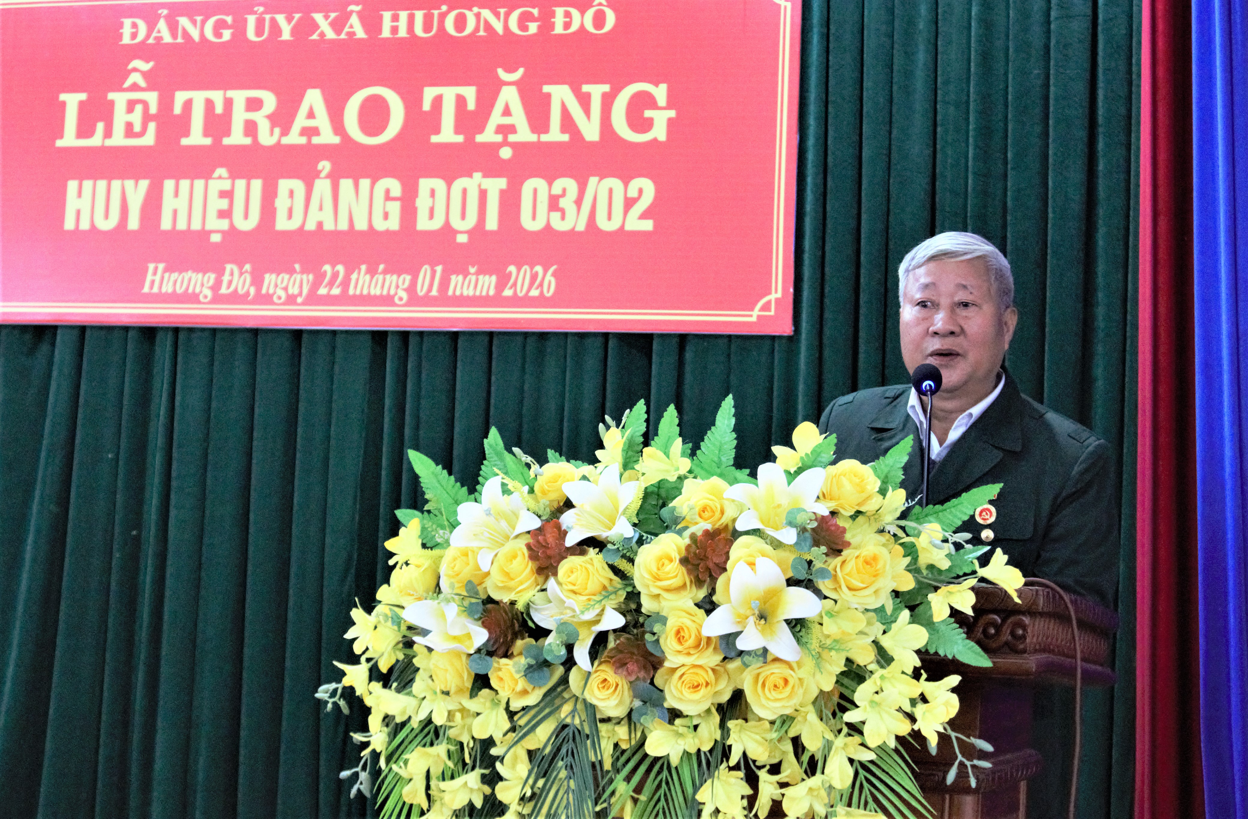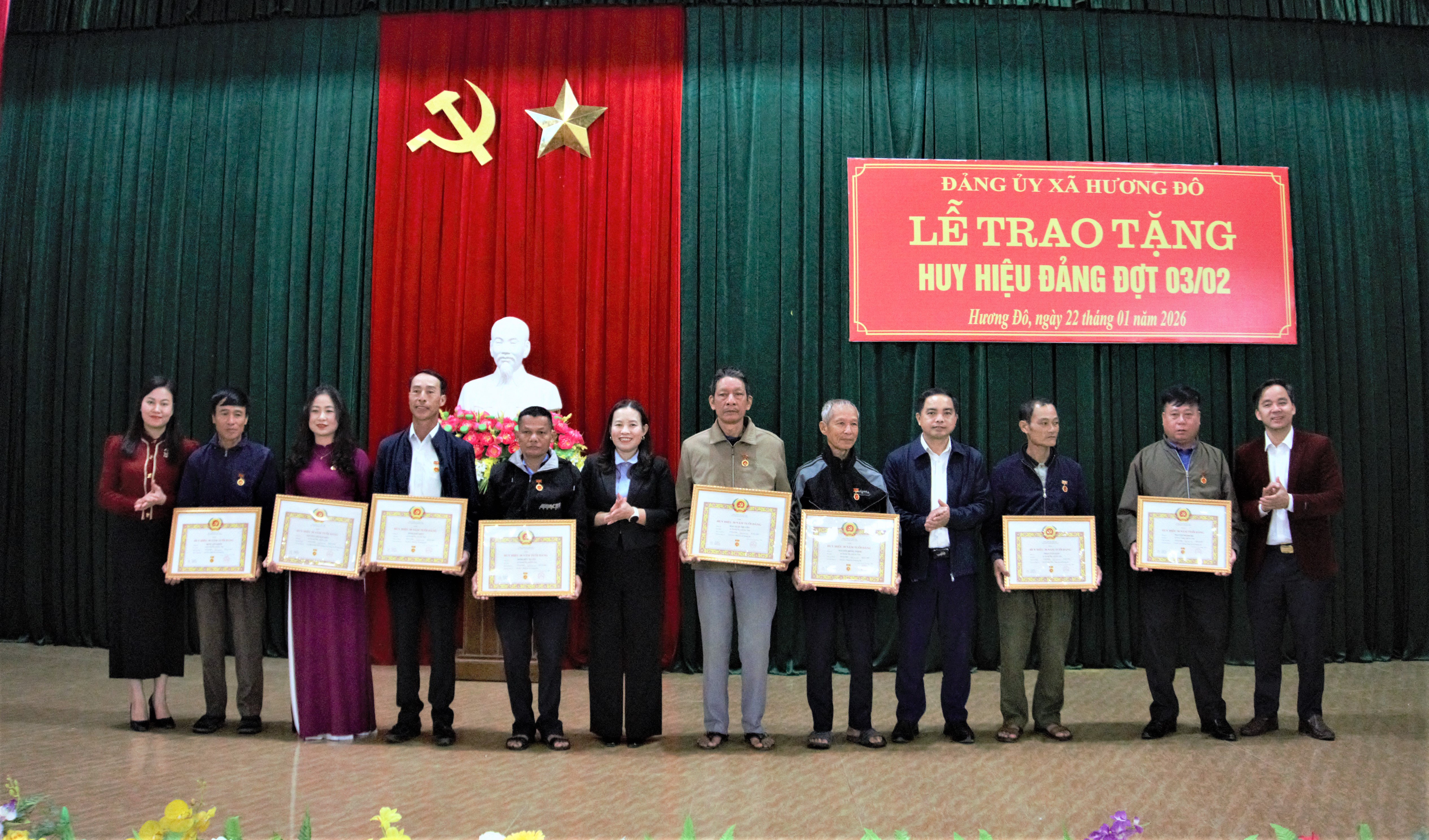 Tại buổi lễ, Thường trực Đảng ủy đã trao Huy hiệu đảng cho 16 đảng viên đang sinh hoạt tại các chi bộ xã Hương Đô. Trong đó có 02 đảng viên được trao tặng Huy hiệu 50 năm tuổi Đảng; 03 đảng viên Huy hiệu 45 năm tuổi Đảng; 03 đảng viên Huy hiệu 40 năm tuổi Đảng và 08 đảng viên Huy hiệu 30 năm tuổi Đảng. Đây là sự ghi nhận xứng đáng của Đảng đối với quá trình rèn luyện, cống hiến bền bỉ của các đảng viên cho sự nghiệp cách mạng của Đảng và địa phương.