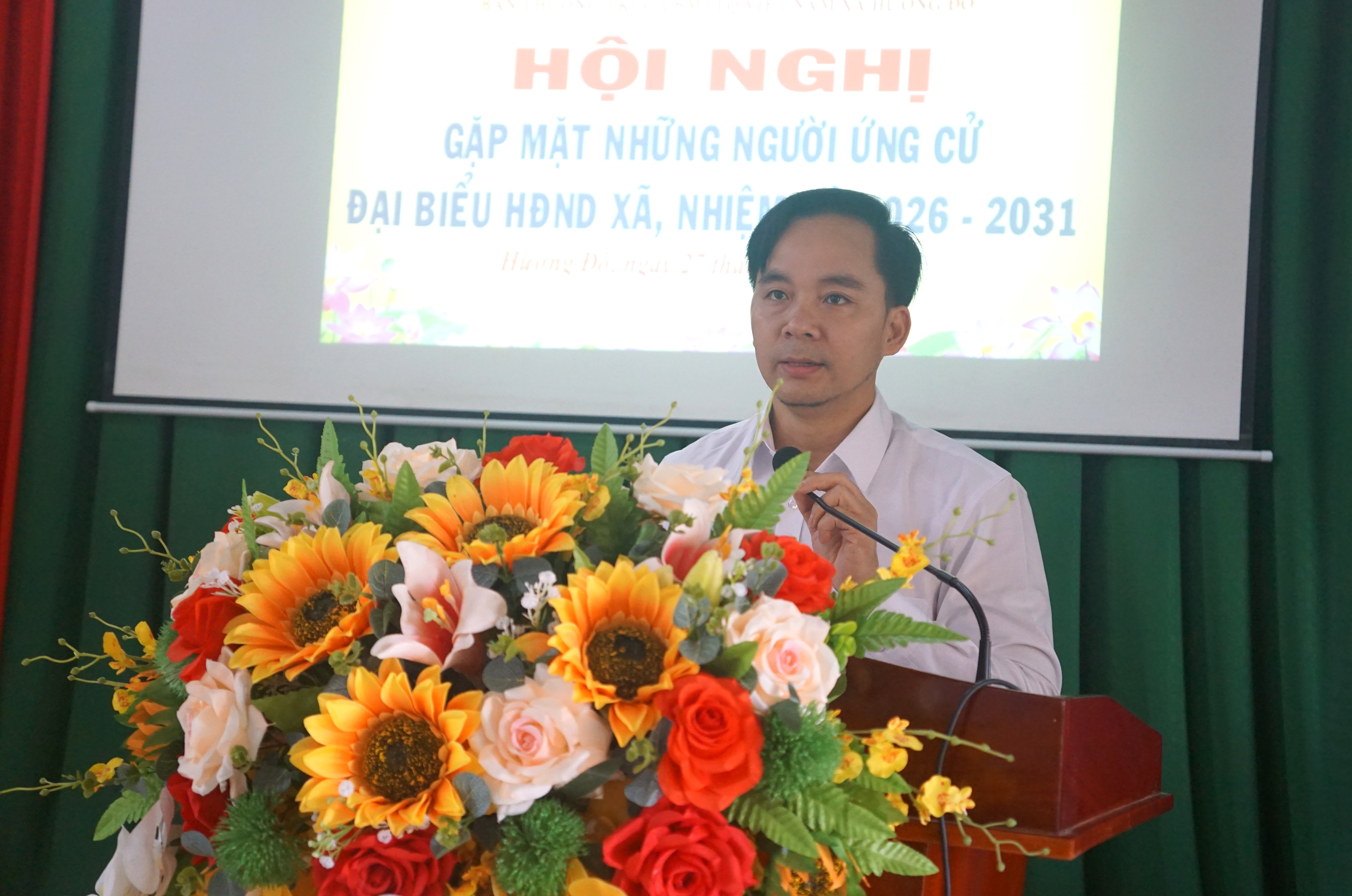 Tại hội nghị, đồng chí Nguyễn Trung Thương, UVBTV, Phó Chủ tịch UBND xã, đã đọc tiểu sử tóm tắt của từng người ứng cử đại biểu HĐND xã khóa XXII, nhiệm kỳ 2026–2031; thông qua báo cáo tình hình kinh tế - xã hội xã Hương Đô. đồng chí Nguyễn Thị Mỹ Dung, Chủ tịch Ủy ban MTTQ Việt Nam xã, triển khai kế hoạch tổ chức hội nghị tiếp xúc giữa cử tri với những người ứng cử đại biểu HĐND xã.