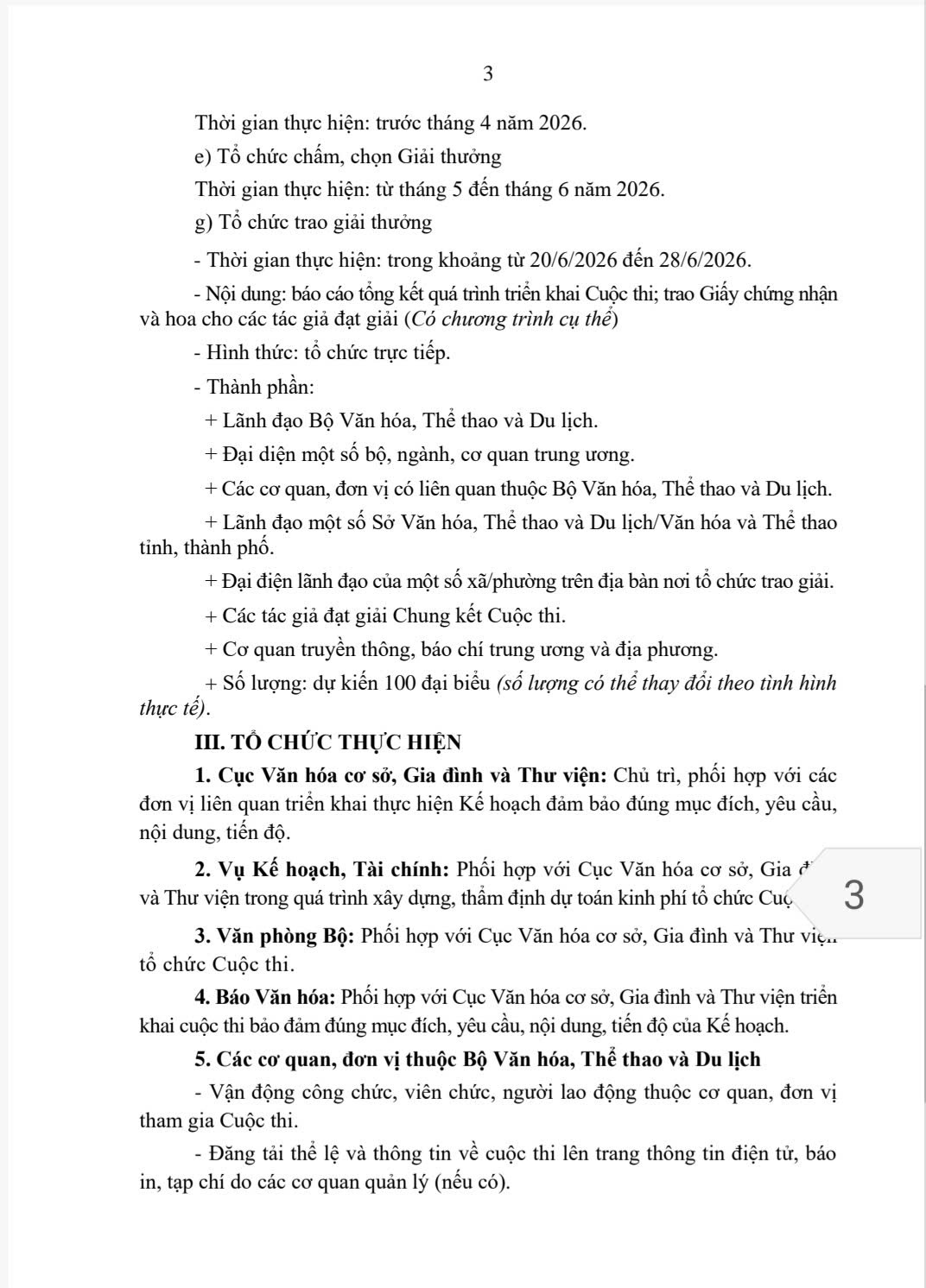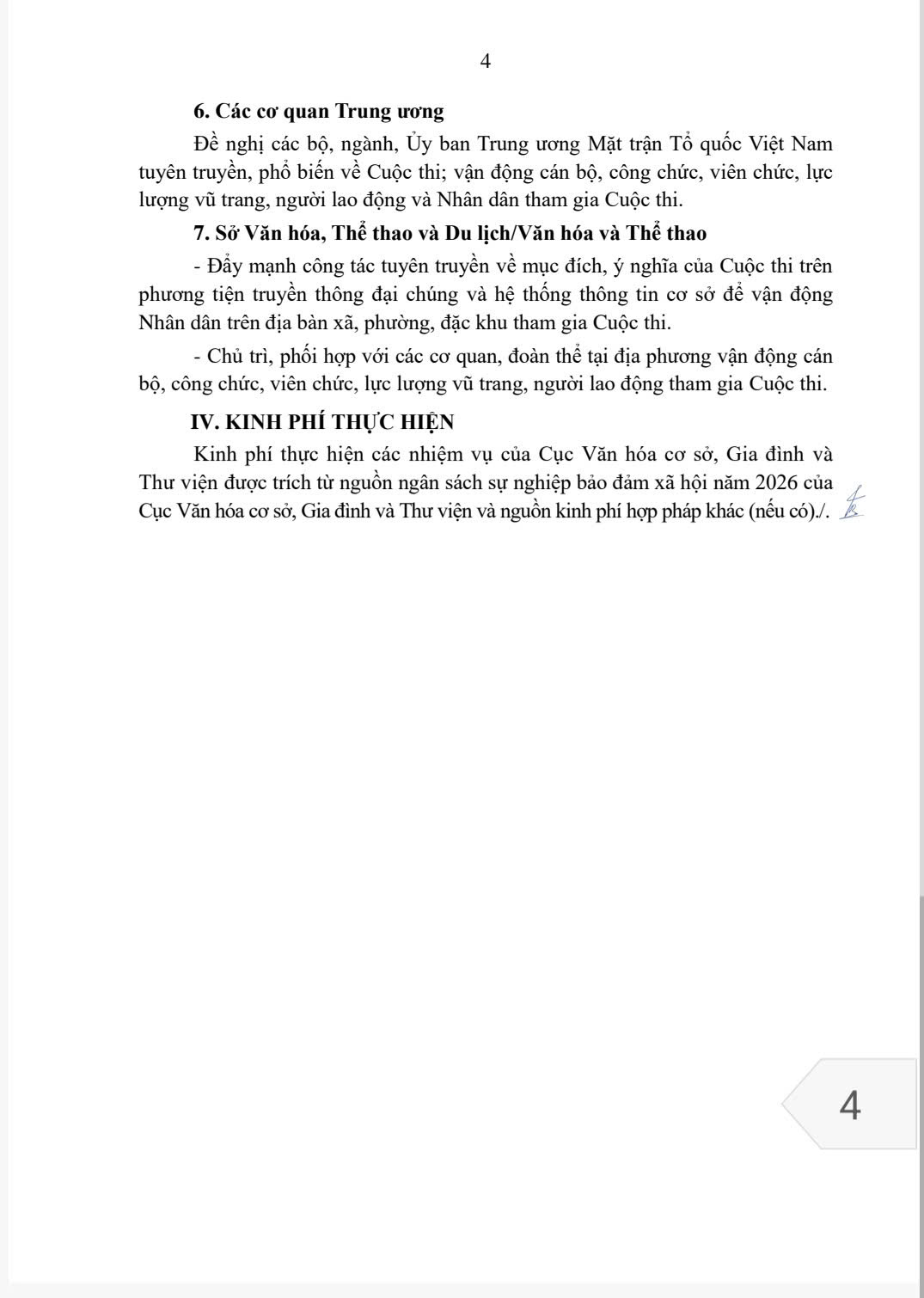 Kế hoạch tổ chức cuộc thi viết với chủ đề “Bữa cơm gia đình ấm áp yêu thương” - hoạt động kỷ niệm 25 năm Ngày Gia đình Việt Nam của Bộ Văn hóa - Thể thao và Du lịch. Cán bộ, công chức, viên chức, lực lượng vũ trang, người lao động, Nhân dân trên địa bàn xã tích cực nghiên cứu tham gia cuộc thi.