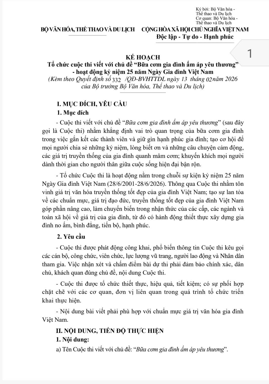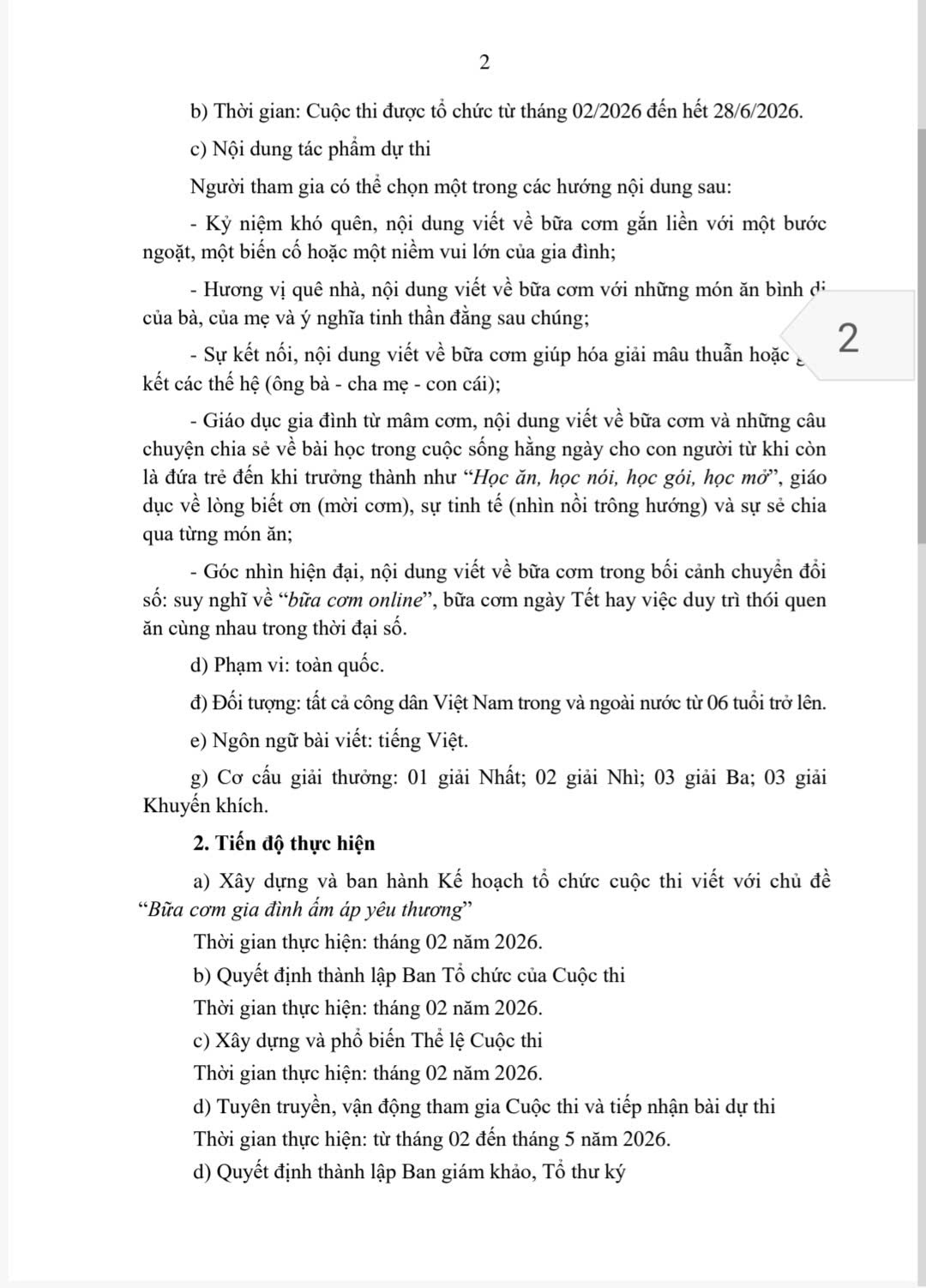 Kế hoạch tổ chức cuộc thi viết với chủ đề “Bữa cơm gia đình ấm áp yêu thương” - hoạt động kỷ niệm 25 năm Ngày Gia đình Việt Nam
