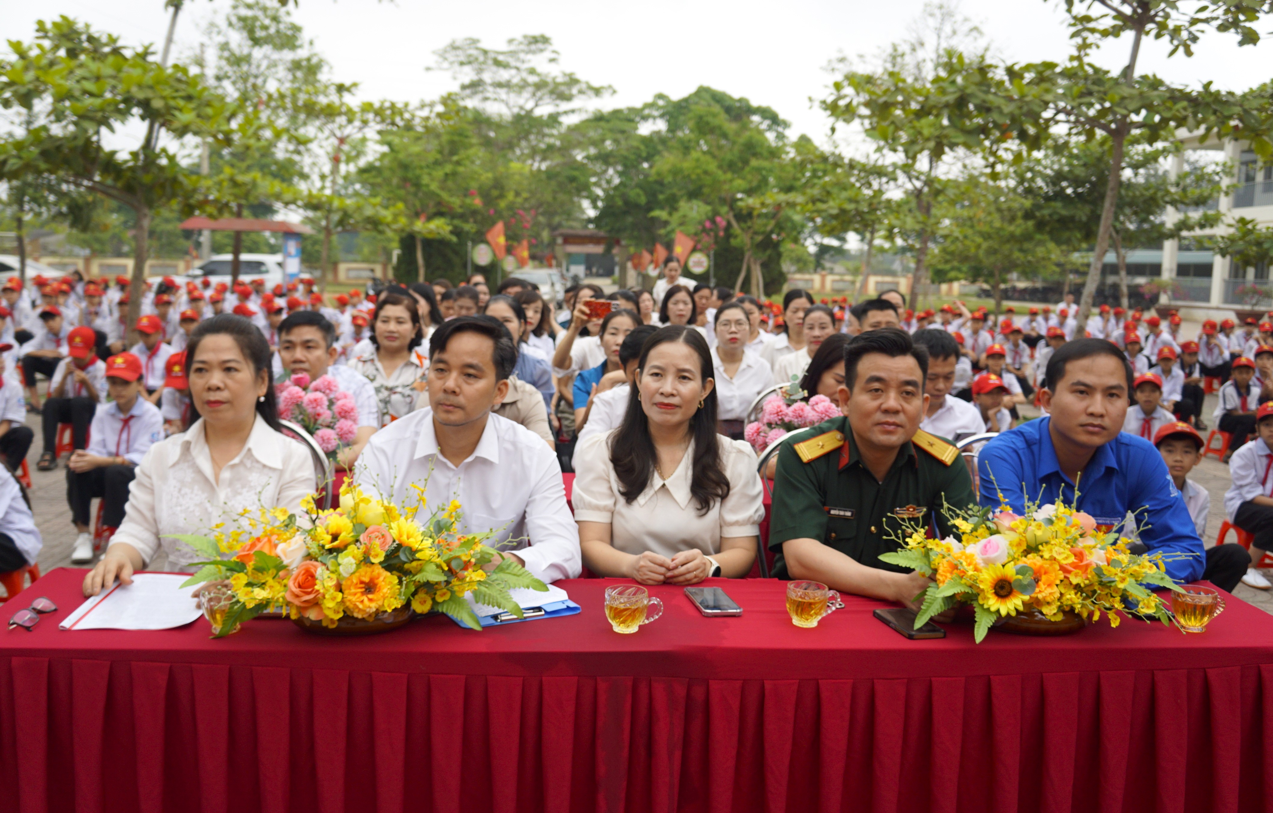 Tham dự buổi lễ có đồng chí Nguyễn Trung Thương – Ủy viên Ban Thường vụ, Phó Chủ tịch UBND xã; đồng chí Nguyễn Thị Mỹ Dung – Ủy viên Ban Thường vụ, Chủ tịch Ủy ban MTTQ Việt Nam xã; đồng chí Nguyễn Văn Hải – Trưởng phòng Văn hóa – Xã hội; đại diện Ban Chỉ huy Quân sự xã, cùng các cán bộ chuyên môn, đại diện các trường học trên địa bàn, đội ngũ giáo viên và toàn thể học sinh Trường THCS Hương Trà.
