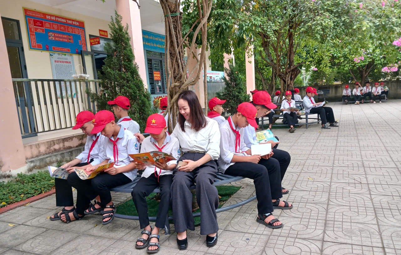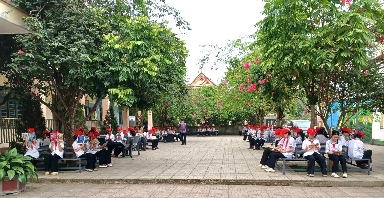 Sau phần lễ, các đại biểu, thầy cô giáo và học sinh cùng tham quan mô hình xếp sách nghệ thuật và khu vực “Thư viện xanh” – không gian đọc thân thiện, gần gũi do chính thầy cô và học sinh nhà trường xây dựng và duy trì.