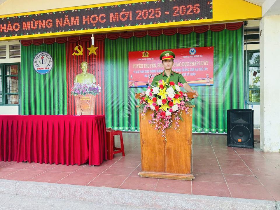 Tham dự buổi tuyên truyền có đại diện Chỉ huy và cán bộ, chiến sĩ Công an xã Hương Đô; Ban Giám hiệu nhà trường; cán bộ, giáo viên, đại diện phụ huynh và gần 500 em học sinh.