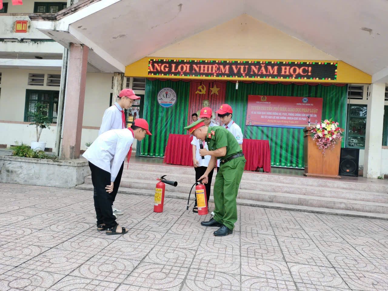 Cán bộ công an xã hướng dẫn kỹ năng phòng cháy, chữa cháy cho học sinh