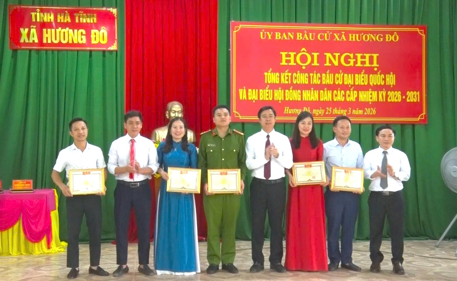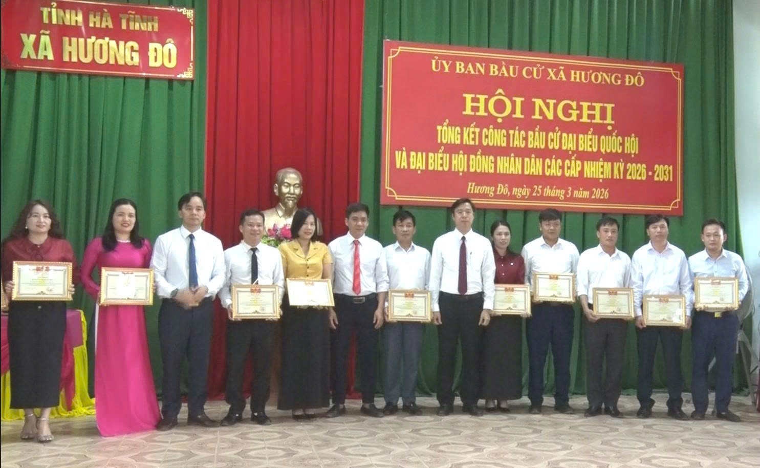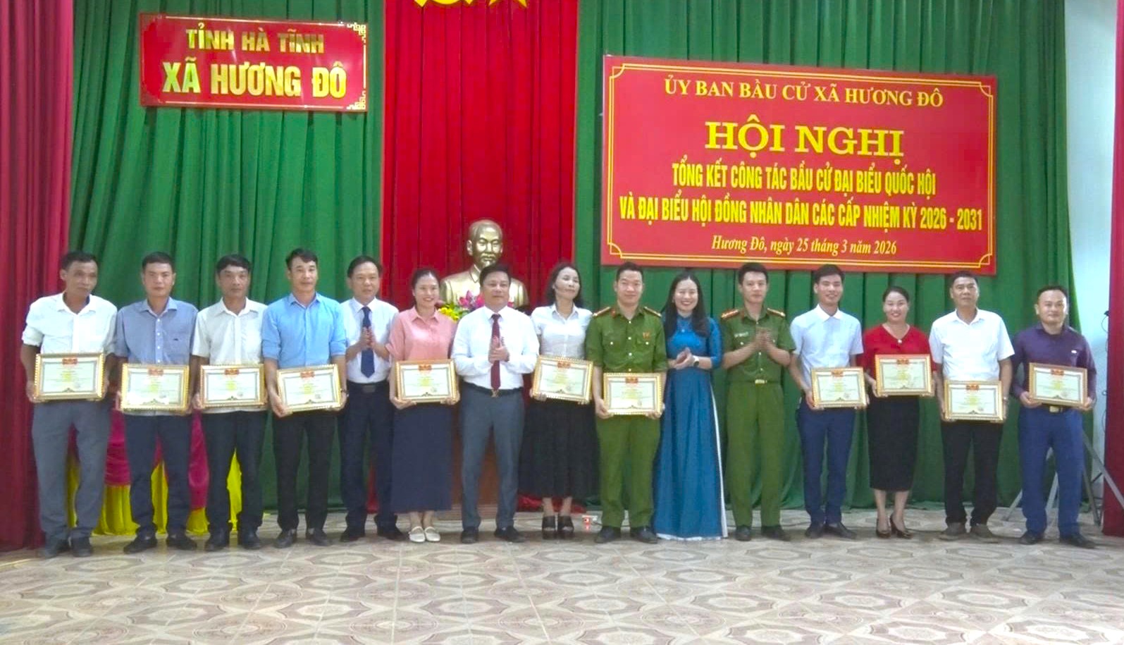 Và trao giấy khen Của Chủ tịch UBND xã Hương Đô cho 5 tập thể và 24 cá nhân có thành tích xuất sắc trong công tác bầu cử đại biểu Quốc hội khóa XVI và đại biểu HĐND các cấp, nhiệm kỳ 2026–2031.